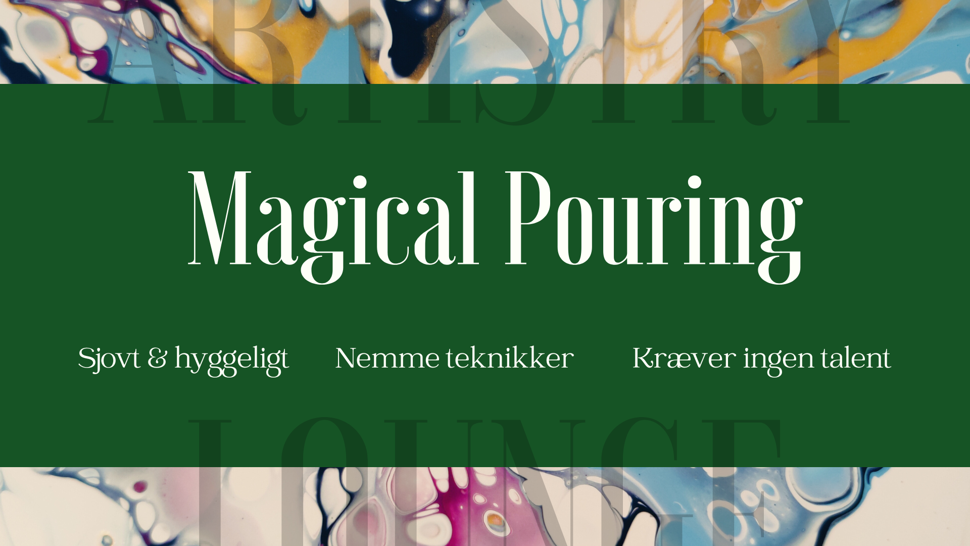 Du bliver guidet trygt og roligt gennem de mest elskede pouring-teknikker, så du kan læne dig tilbage i processen og opleve, hvordan farverne flyder, mødes og danner fantasifulde mønstre på magisk vis helt af sig selv!